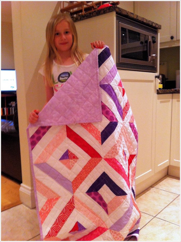 Posted by The Quilt Room on August 19, 2013Sometimes you get a customer in the shop who you want the world to know about. This nine year old, Kate Lyall, came into the shop in Dorking with her mother and wanted to make a quilt. Oh yes - I can hear you say it - her mother will probably be doing it. No such thing! Our ever helpful Margaret was in the shop to assist and helped Kate with her fabric selection and showed her how to get started. Every week for the next five weeks Kate came into the shop with her mother as the quilt progressed. When it got to quilting, Margaret suggested tying for ease but no - Kate wanted to quilt it properly and so she did.